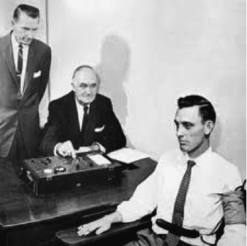 The polygraph, more commonly known as a lie detector, is an interrogation tool that has been used by law enforcement and intelligence agencies since the 1920s. It is based on the principle that people exhibit symptoms of stress when they are lying, including rapid breathing, increase in pulse rate and blood pressure, and sweating. The machine consists of a band that is strapped above the subject’s esophagus, a blood pressure cuff, and fingertip sensors to measure galvanic response.